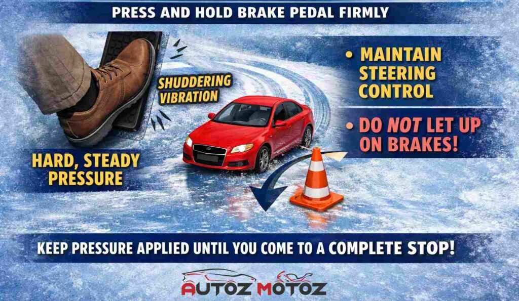 Emergency stops on frozen surfaces are most effectively managed when the vehicle’s anti-lock braking system is fully engaged. If a skid cannot be corrected or an obstacle must be avoided, the brake pedal should be pushed down with maximum force and held firmly without release. Because the onboard computer is designed to optimize deceleration, each wheel is monitored to provide the most aggressive braking allowed by the available traction. Furthermore, the ability to maneuver around hazards is maintained even while the pedal is fully depressed. Although a shuddering vibration is often felt through the foot as the system activates, the pressure must be sustained until the vehicle is safely halted.