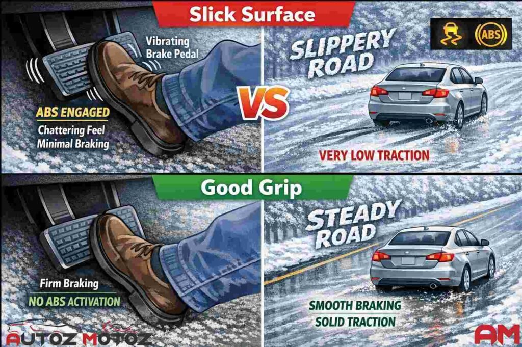 Changing grip levels are more accurately understood when road conditions are periodically assessed throughout a winter journey. In addition to monitoring stability-control indicators, the anti-lock braking system is frequently utilized to gauge available traction. To perform this check safely, the brakes are applied gently for a brief moment while traveling in a straight line, provided no other vehicles are nearby. If a chattering sensation is felt underfoot with minimal deceleration, the presence of a very slick surface is confirmed by the system’s activation. Conversely, if the vehicle is slowed at a reasonable rate without intervention, a more reliable grip is indicated.