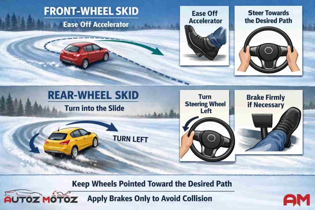 Control is successfully regained when a sudden loss of traction is met with composure rather than panic. Should a front-wheel skid occur, where a wider arc is traveled than intended, the accelerator must be eased until grip is restored to the front tires. Conversely, if a rear-wheel skid is experienced and the back of the car begins to swing, the steering wheel should be turned quickly in the same direction as the slide. For instance, if the rear is felt swinging to the left, the wheel must be turned to the left accordingly. Throughout these maneuvers, the wheels are kept pointed toward the desired path so that the vehicle is safely stabilized. While the brakes are generally avoided during recovery, the pedal should be firmly applied only if an impact is deemed imminent.