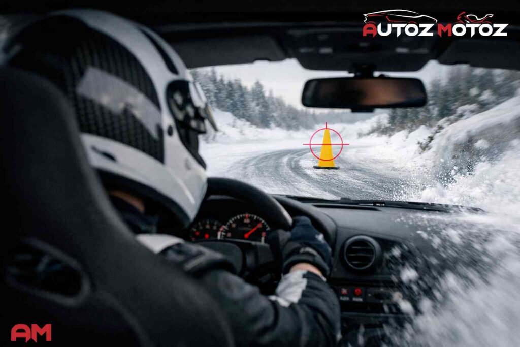 If a loss of traction occurs, the gaze must be fixed precisely on the intended path rather than the direction of the slide. While the accelerator is eased for front-wheel skids, the steering wheel is turned quickly in the same direction as the swing for rear-wheel skids.